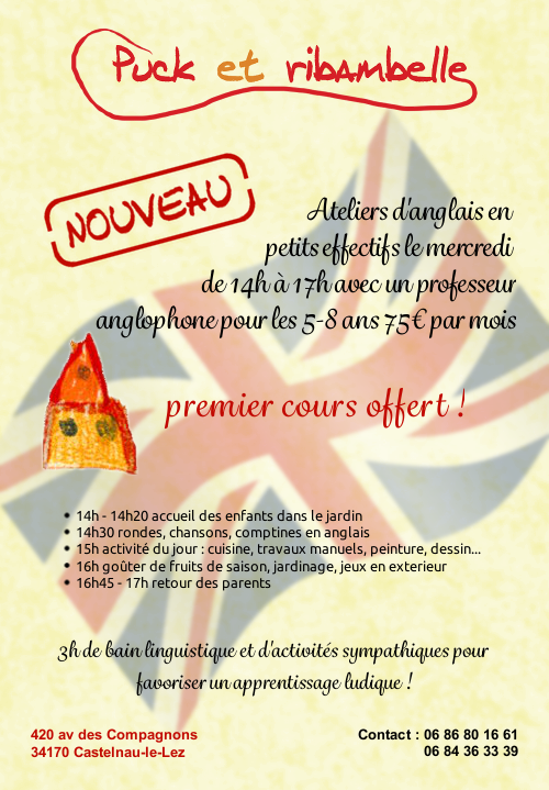 stage anglophone aux vacances de la Toussaint du 23 au 26 février de 9h à 12h.